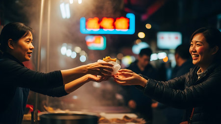 The image captures a moment of two women sharing street food at a vibrant night market. The atmosphere is lively, with blurred lights and people in the background, suggesting a bustling environment. The women are exchanging a food item wrapped in paper, highlighting the communal aspect of enjoying street food.