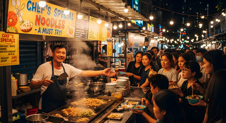 A friendly Asian chef serves freshly cooked noodles to a crowd of customers at a bustling outdoor night market. The food stall is brightly lit with warm lights, steam rises from the grill, and people are happily eating. The scene captures the vibrant atmosphere of street food culture.