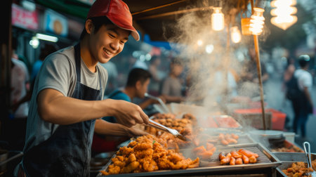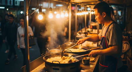 Street food vendor in a bustling night market serving traditional fried dishes