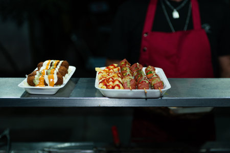 delicious street food displayed in food truck window, created with generative ai
