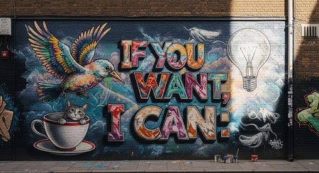 A highly detailed and vibrant graffiti mural adorns a dark brick wall. The a colorful, bird in flight on the left, a small cat peeking out of a teacup below it, and a large, illuminated lightbulb on the right, symbolizing an idea. Prominently displayed in the center are the words IF YOU WANT, I CAN: in bold, multi-colored, 3D lettering. The mural is rich in color and texture, showcasing a blend of natural and symbolic imagery.