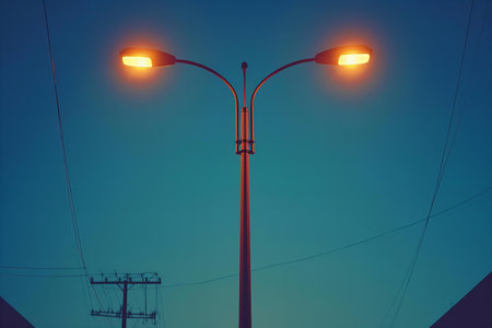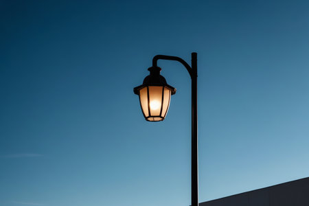 A street light stands tall against a vibrant blue sky, casting a warm glow on the peaceful surroundings below.