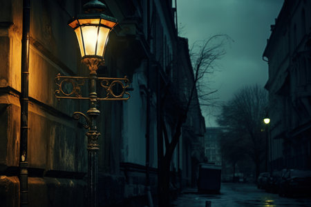 Vintage style street lamp illuminating the misty twilight, creating a serene and atmospheric urban landscape