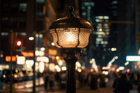 A charming vintage street lamp casts a warm glow in a bustling city, creating an enchanting scene with blurred bokeh lights that evoke a sense of tranquility and beauty.