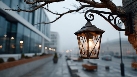 A beautifully designed vintage street lamp hangs from a branch, illuminating a foggy urban setting, creating a serene and cozy atmosphere.