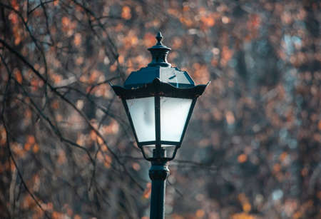 Twilight Glow Vintage Streetlamp Among Autumn Leaves.