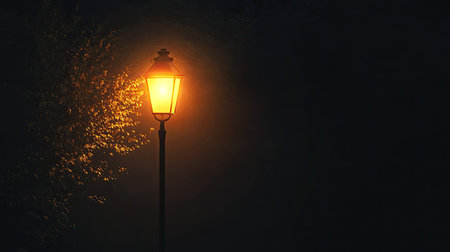 A vintage street lamp casts a warm, inviting glow in a dark night scene, surrounded by misty foliage. This serene image captures the essence of tranquility and solitude.