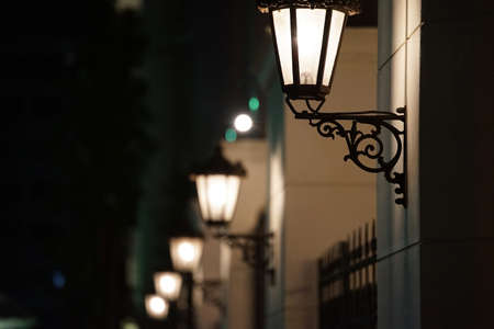 Night view of many streetlights attached to the wall