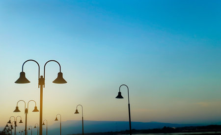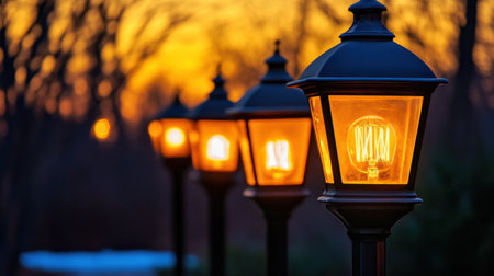 A picturesque scene featuring elegant street lamps casting a warm glow during sunset. The tranquil ambiance and blurred background create a peaceful outdoor atmosphere.