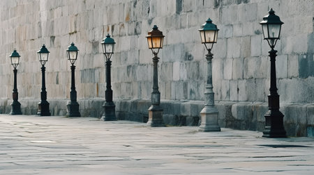 Defocused foggy streets lined with old lampposts and abandoned buildings transporting the viewer to a bygone era where time stands still.