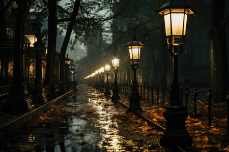 A captivating urban evening scene featuring glowing street lanterns casting reflections on wet pavement beneath a dramatic, cloudy sky.