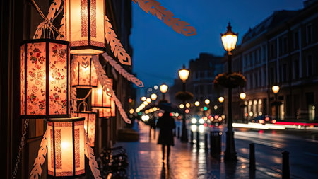 An evening view captures illuminated lanterns hanging on a shop front, with a blurred cityscape in the background. The scene features warm, inviting light against a cool, blue-toned backdrop. The image composition may be useful for editorial articles or commercial projects requiring ambiance and atmospheric visuals.