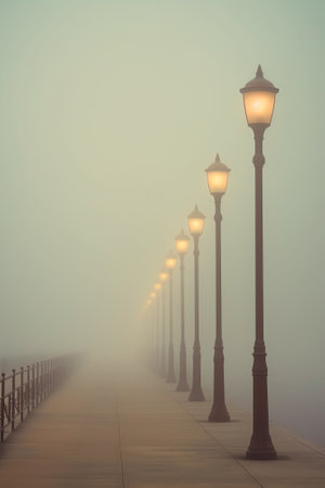A pathway lined with streetlights fades into a dense fog, creating an eerie yet beautiful scene. Trees add a touch of nature to the urban landscape.