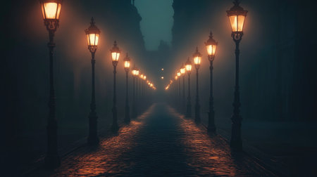 A quiet street lined with old-fashioned lampposts, each casting a warm glow onto cobblestone pavement as fog rolls through the night air