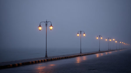 A serene urban scene shrouded in mist, with streetlights casting a warm glow on an empty road. Perfect for conveying tranquility and solitude in a city setting.