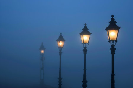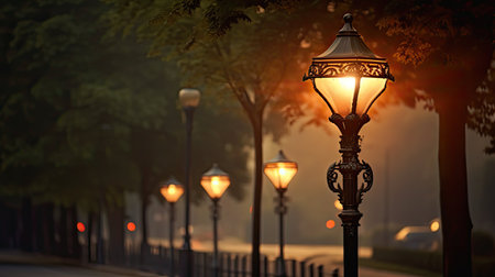 Vintage style street lamp illuminating the misty twilight, creating a serene and atmospheric urban landscape