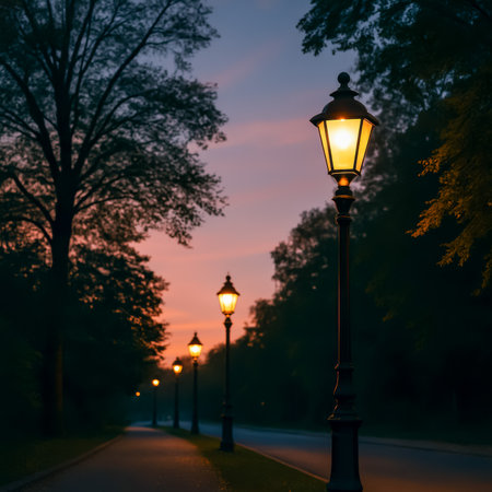 This captivating image features elegant street lanterns casting a warm glow along a tranquil urban walkway at dusk. Perfect for themes of beauty and serenity.