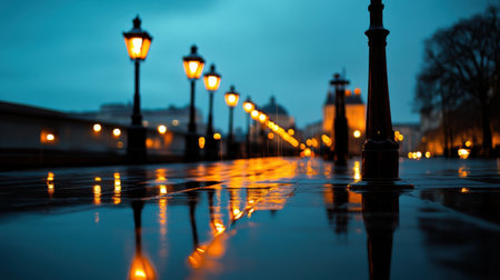 Soft amber light from antique lamps reflects on misty waters, creating a nostalgic, serene atmosphere in an early evening cityscape by the river.