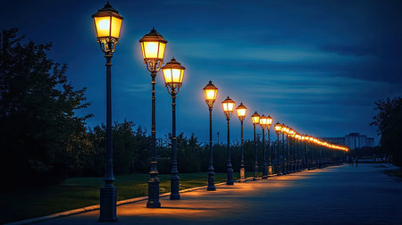 This captivating image features elegant street lanterns casting a warm glow along a tranquil urban walkway at dusk. Perfect for themes of beauty and serenity.