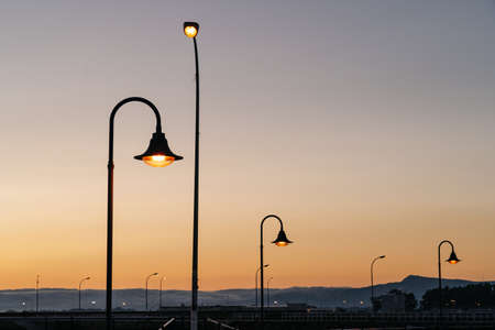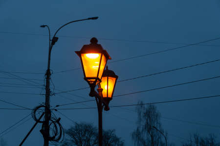 Urban landscape. Street lamp with a lamp in a classic style against a purple sky. Beautiful postcard.