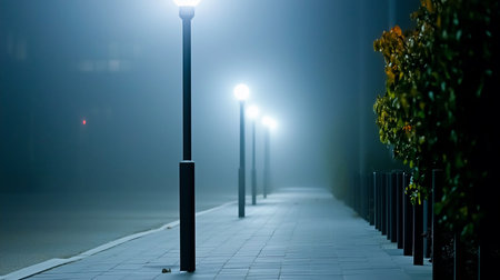 A serene urban scene shrouded in mist, with streetlights casting a warm glow on an empty road. Perfect for conveying tranquility and solitude in a city setting.