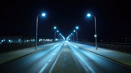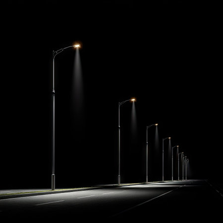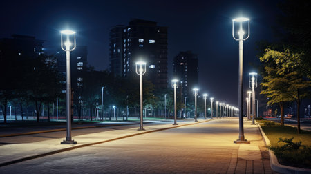A row of streetlights illuminate a dark environment. The image showcases architectural lighting with a focus on the fixtures and the effect of light. The composition features clean lines, creating a sense of depth against the darkness. This image could be used for various commercial and editorial purposes.