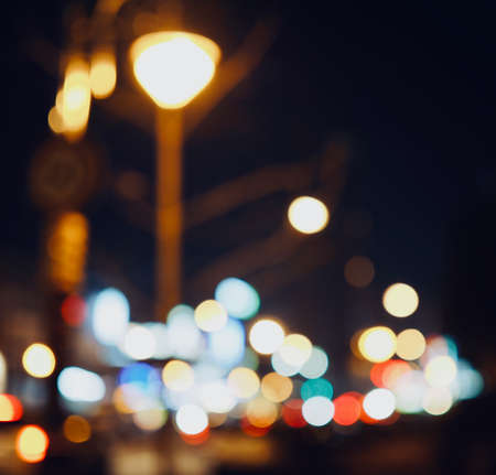 Colorful background of night street with bokeh blurred light cars and street lamps. Abstract backdrop of defocused lights at city life. Concept of cityscape backgrounds for design. Copy text space
