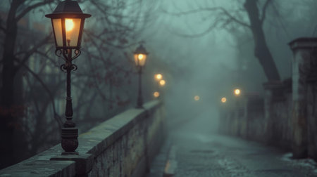 Defocused foggy streets lined with old lampposts and abandoned buildings transporting the viewer to a bygone era where time stands still.