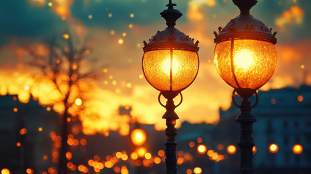 A row of vintage streetlights illuminate a narrow street in the city as the sun sets, casting a warm glow over the buildings and creating a nostalgic atmosphere.