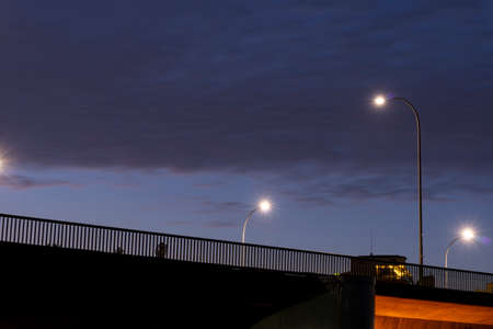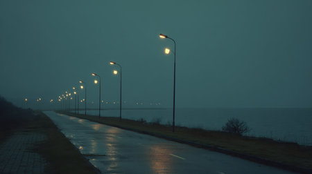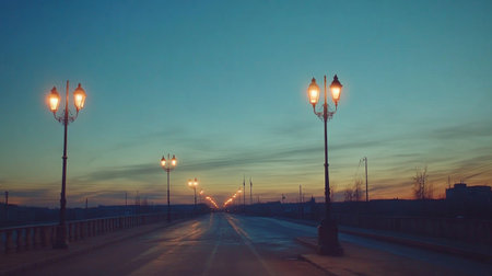 A tranquil urban night scene featuring illuminated street lamps along a quiet road, capturing the serene essence of a modern city at dusk, perfect for evening aesthetics.