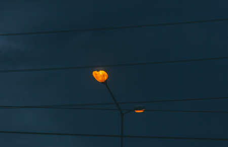 street flickering light and cable line against dark cloudy sky before rain in thailand.