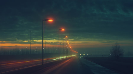 A dramatic perspective of streetlights along a highway at dusk, with their beams cutting through the darkening sky and illuminating the road ahead.