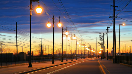 A tranquil urban evening scene featuring street lights casting a warm glow along a quiet road, framed by power lines under a vibrant dusk sky.