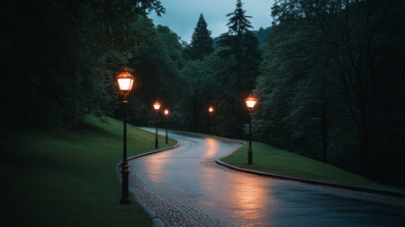 A tranquil night scene featuring a winding pathway lined with glowing street lamps. The wet road reflects the soft light, enhancing the serene atmosphere.