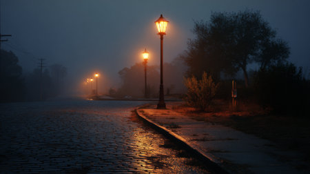 A serene night scene featuring a fog-draped street illuminated by vintage lanterns, casting soft light on a cobblestone path, evoking a sense of mystery and tranquility.