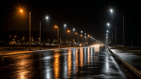 An enchanting nighttime scene featuring an urban road lined with bright street lights. The wet asphalt surface reflects light, creating a serene city atmosphere.