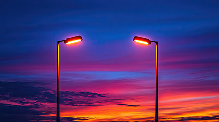 Symmetrical composition of two LED street lamps framing a colorful evening horizon, creating a serene urban scene