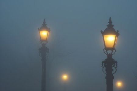 A foggy night adds an eerie element to the old gas lamps making them seem almost haunted