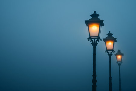 Street lamps casting a dim light in the fog --ar 3:2 Job ID: cde72b0d-ed5d-4047-a445-dd2931bb36e6