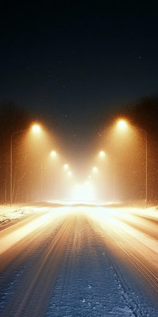 A captivating nighttime urban road scene featuring glowing streetlights reflecting on a wet surface, evoking a serene yet vibrant atmosphere in a city.