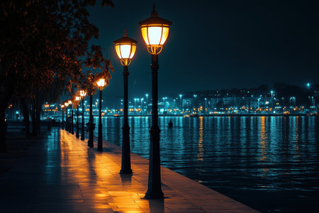 Warmly lit street lamps illuminate a serene waterfront walkway at night, reflecting on the calm water nearby.