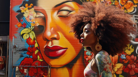 Beautiful Afro-American woman with a model-like appearance exploring vibrant urban art