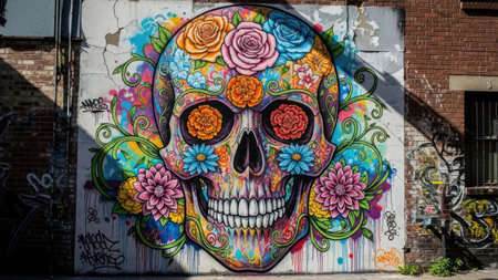 A vibrant mural depicts a decorated skull bursting with colorful flowers against a textured wall. The artwork uses a rich palette of hues and intricate details. The style suggests urban art, likely outdoors with sunlight. Suitable for a variety of creative projects, this image conveys themes of art and culture.