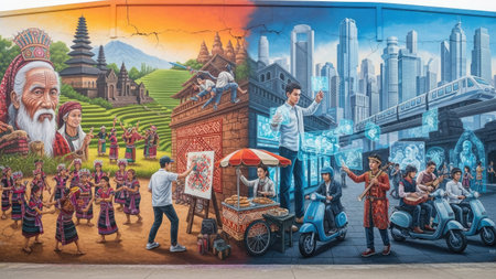This colorful mural presents a juxtaposition of cultural heritage and contemporary life. It features figures engaged in various activities, alongside architectural elements and landscapes. The artwork's style incorporates vivid colors and detailed representations. It may be suitable for illustrating themes related to culture, urban environments, or community.