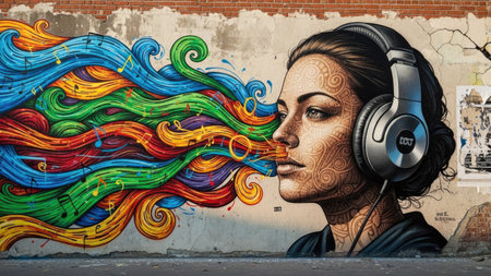 A woman wearing headphones is depicted, with colorful, flowing waves emanating from them, suggesting music or sound. The artwork features diverse colors, textures, and a detailed style. This image could be used for various commercial projects related to music, art, audio, or creative expression. The setting appears to be an urban environment.