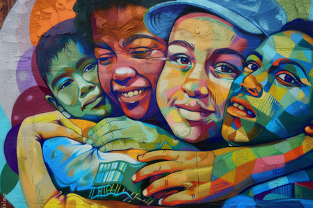 Graffiti-style mural depicting a diverse family unit embracing each other in a heartfelt hug, A graffiti-style mural of a diverse family unit embracing each other in solidarity