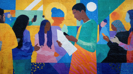 A dynamic urban setting is celebrated through a vivid street mural showing cultural unity and heritage.