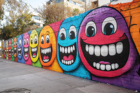 A vibrant mural of smiling teeth on a city wall