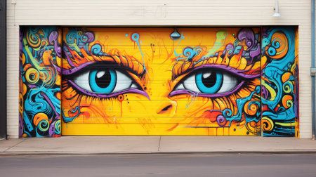 A striking graffiti mural captures the essence of urban art with a bold depiction of colorful, stylized eyes on a city wall. Resplendent.