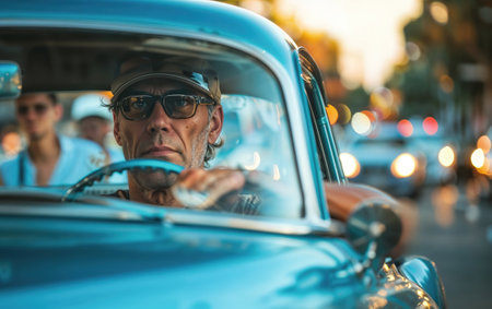 Mature man wearing sunglasses and a hat, driving a retro car on a bustling city street